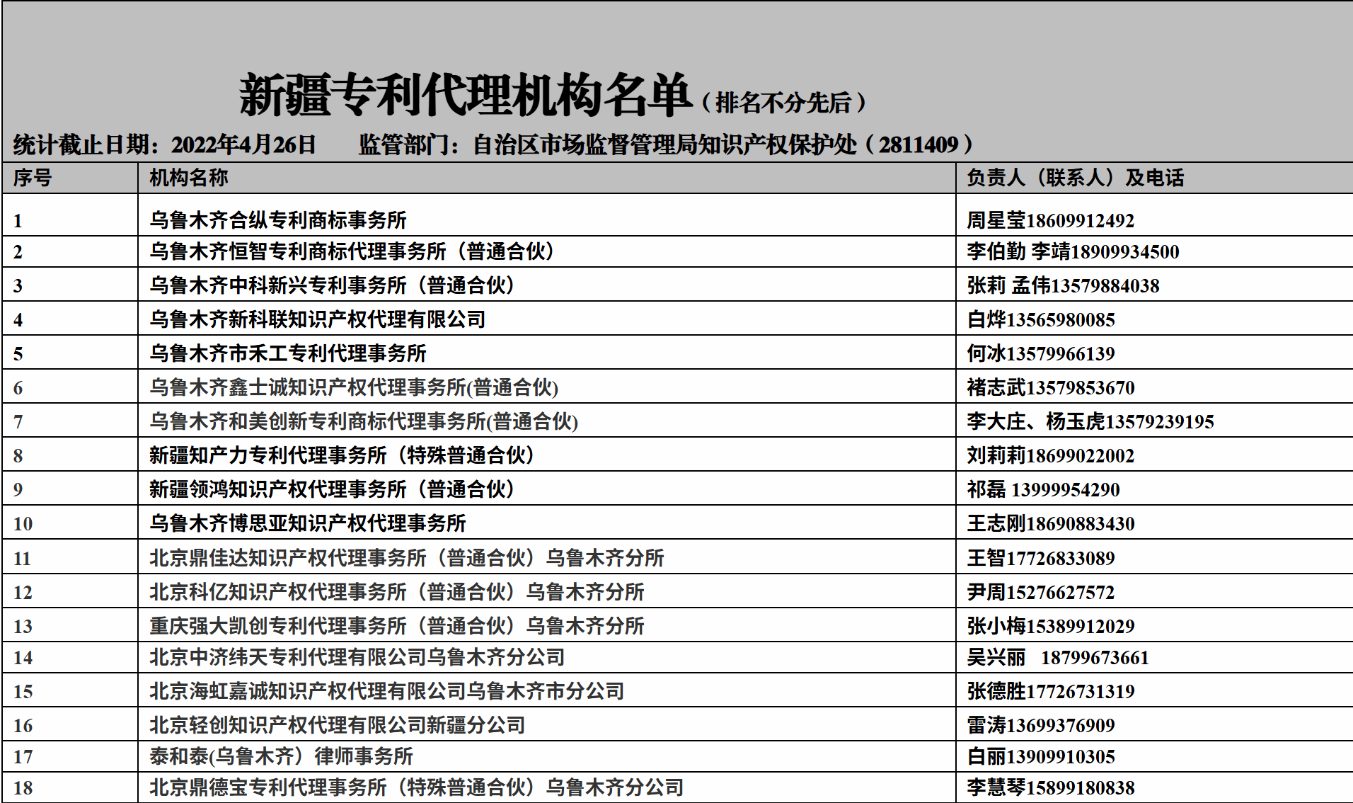 为进一步规范知识产权代理行为,方便公众查询新疆合法的专利代理机构信息,现将新疆专利代理机构名单公示如下: